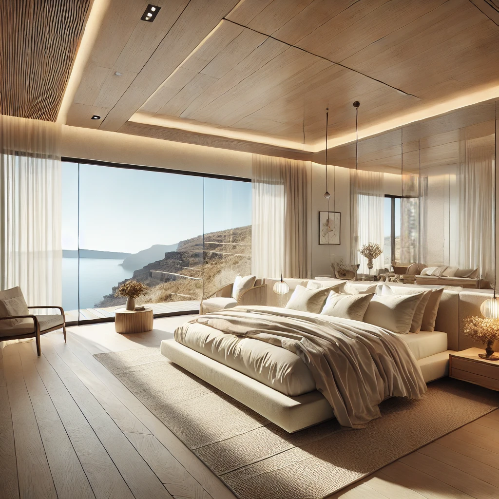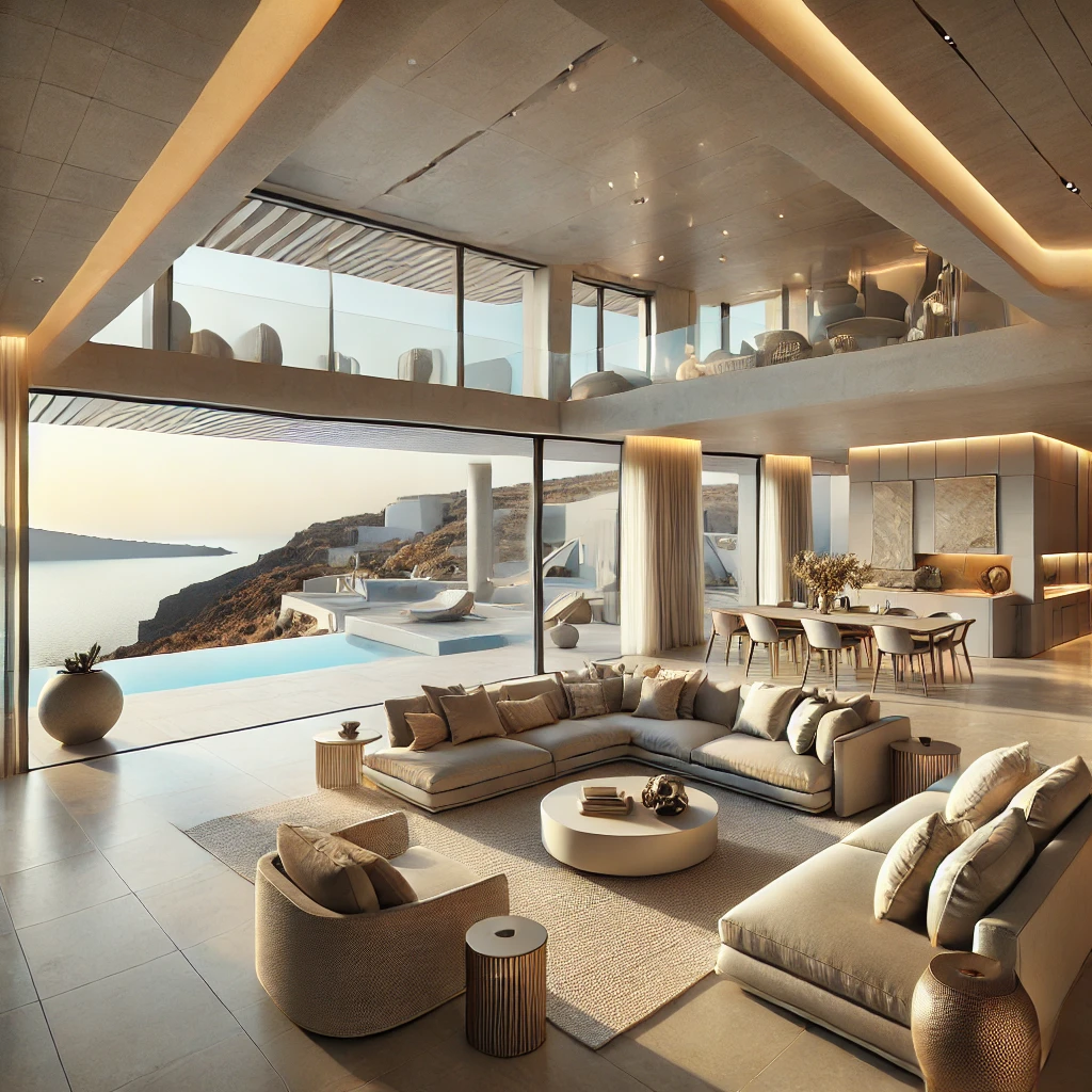 A stunning modern minimalist villa situated on the beautiful island of Santorini, Greek Islands. Featuring sleek lines, expansive glass windows, and a seamless infinity pool, this villa embodies luxury and simplicity. The open-concept living spaces are designed with high-end finishes, natural stone floors, and neutral tones, creating a tranquil and sophisticated atmosphere. Perfectly blending with the natural surroundings, this villa offers breathtaking views of the Aegean Sea.